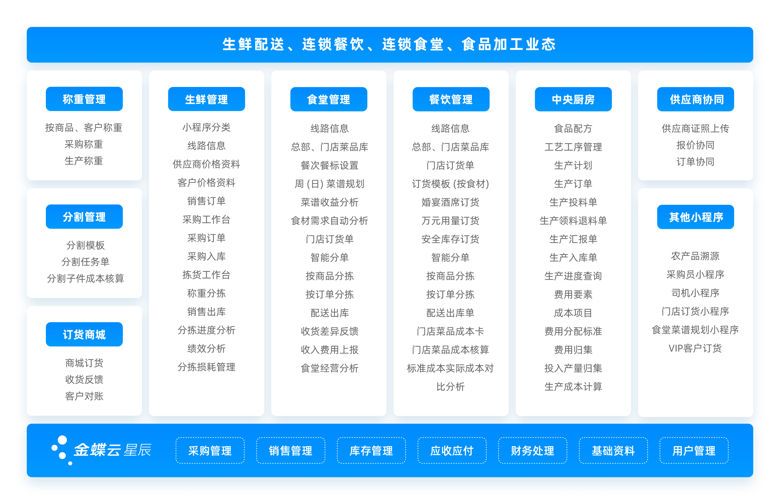 | 六大小程序应用,实现端到端打通 | 提供六大小程序应用,实现从订货、总部接单、采购下单、供应商接单、供应商报价、仓库入库与分拣、司机与物流、收货验收等环节全流程打通,提升作业效率 | |