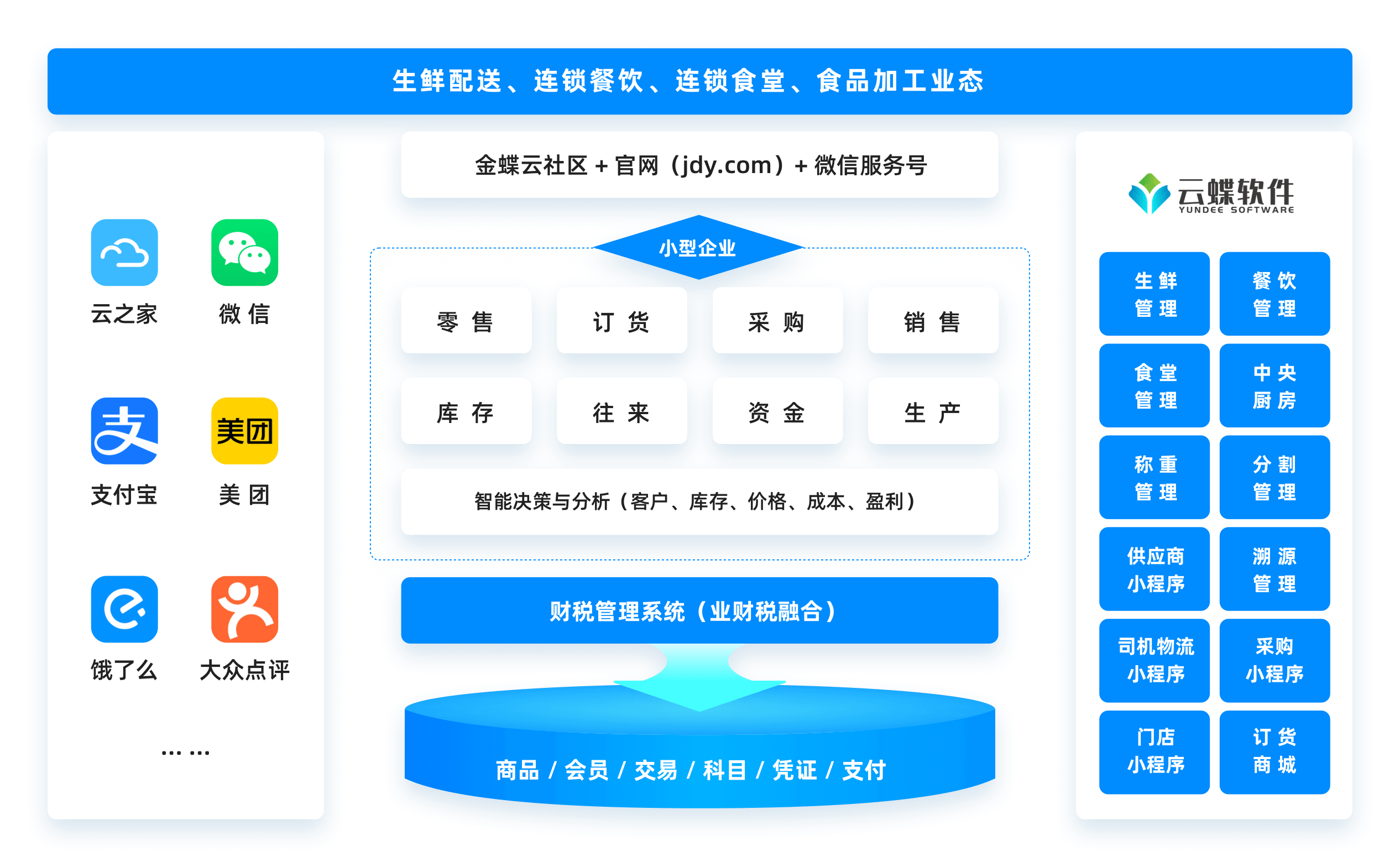 | 业务财务一体化融合 | 实现商城接单、采购管理、称重分拣、销售管理、库存管理、供应商协同、财务对账、收付款、开票、核销、资金账一体化运行,同时实现财务凭证自动生成,无需财务系统、业务系统两套系统重复输入单据,导致业务账与财务账不一致情况 |