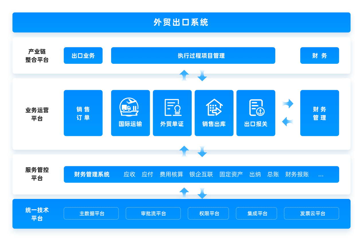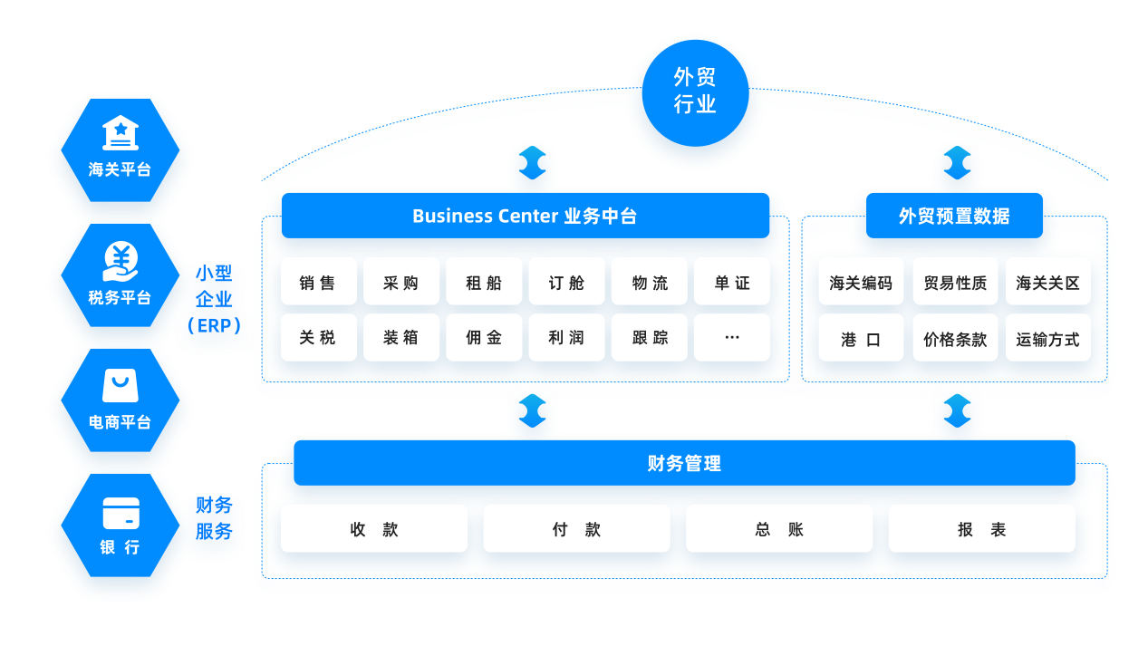 满足外贸企业自营出口业务管理需求,为小型外贸企业提供全流程业务管理,实现业财一体化